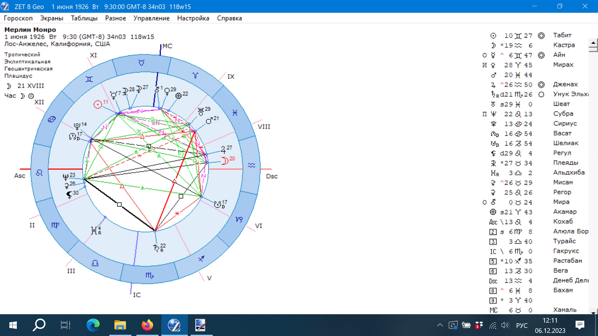 Для примера приведу гороскопы известных людей. Первая Мерлин Монро. Как известно, у нее были серьезные неврозы. Это видно из ее гороскопа. У нее Нептун расположен в первом доме и находится в комбинации тау квадрат с Сатурном и Луной. Также с Марсом в Рыбах в квинконсе. То есть есть основные параметры неврозов, которые мы с вами изучим уже скоро на курсе “Астрология семи тел” и у нее их в гороскопе несколько.