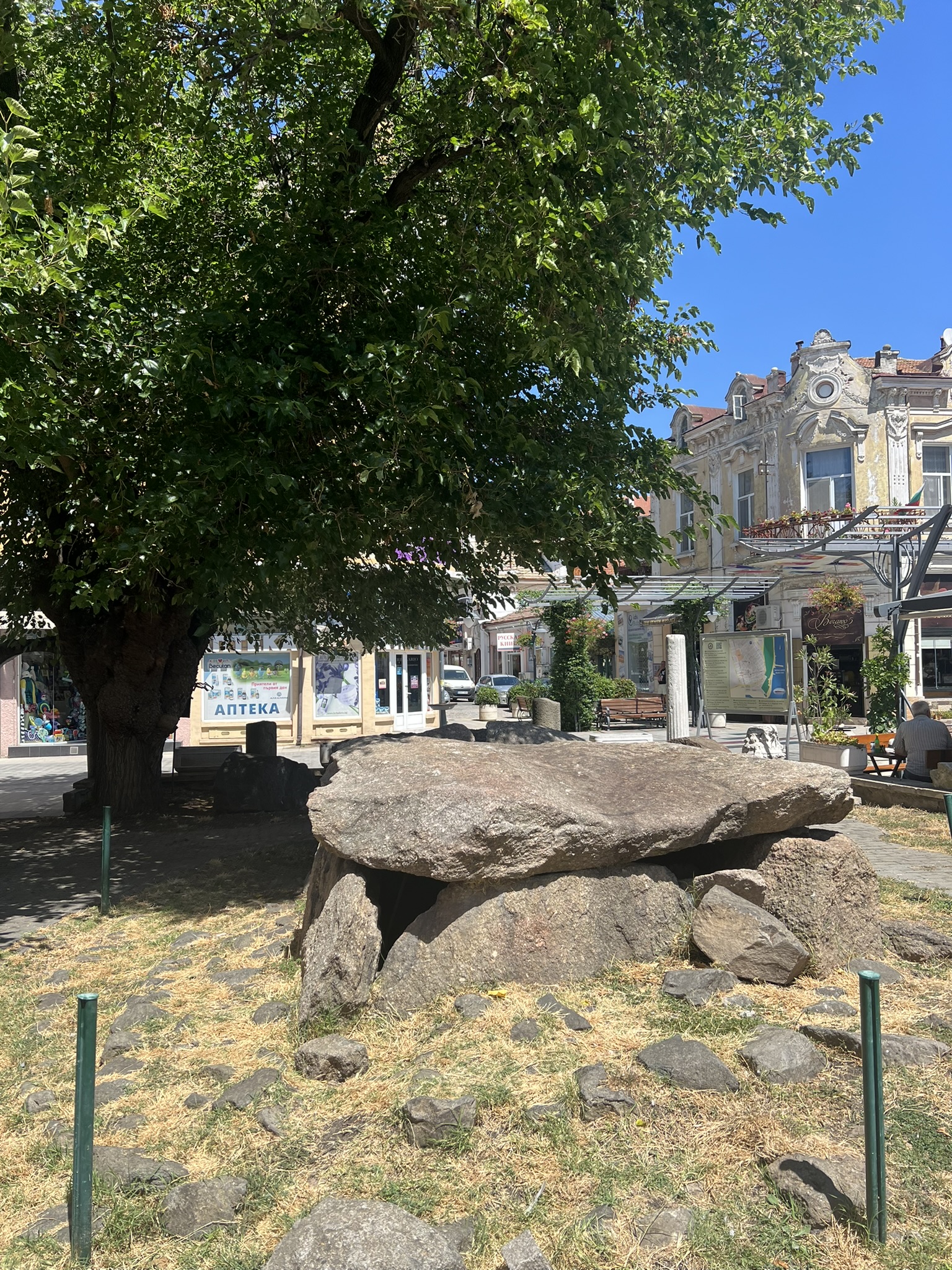 Слева от входа в музей находится каменный дольмен из Странджи,