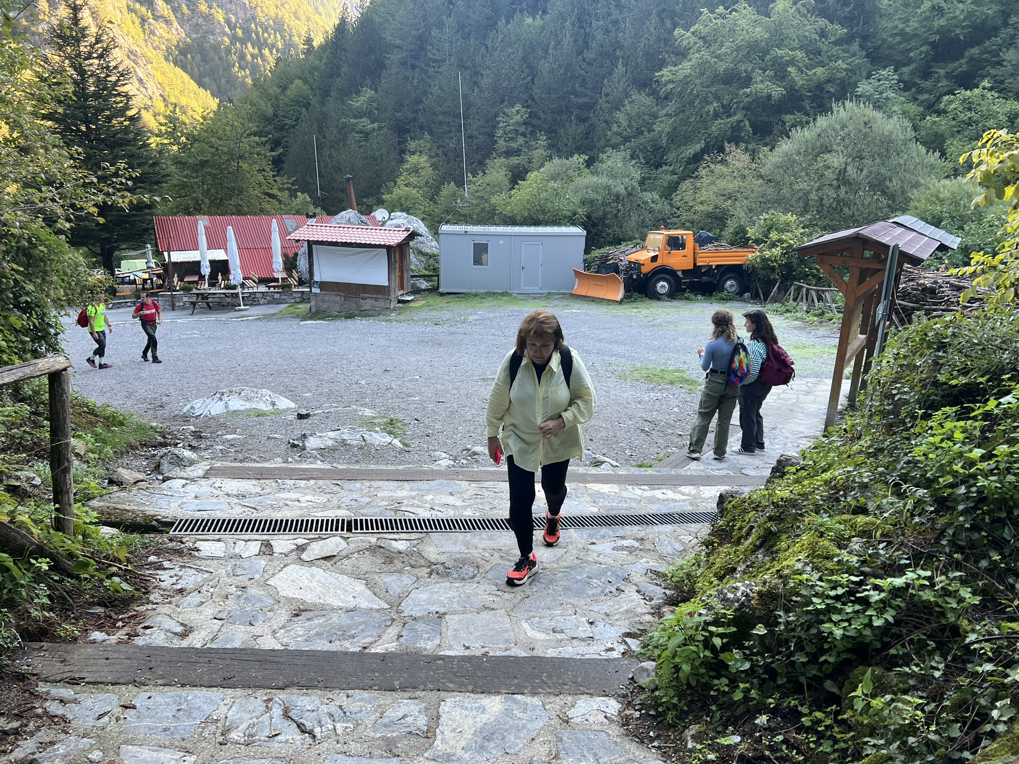 На высоте 2100 метров находится приют, где можно выпить чаю, перекусить и заночевать. Таксист пока вез нас до Прионии все время отговаривал и пугал: “Камни падают, дорога трудная. Идите лучше не наверх а по дороге до Литохоро и погуляете и красоты природы посмотрите и не опасно”.