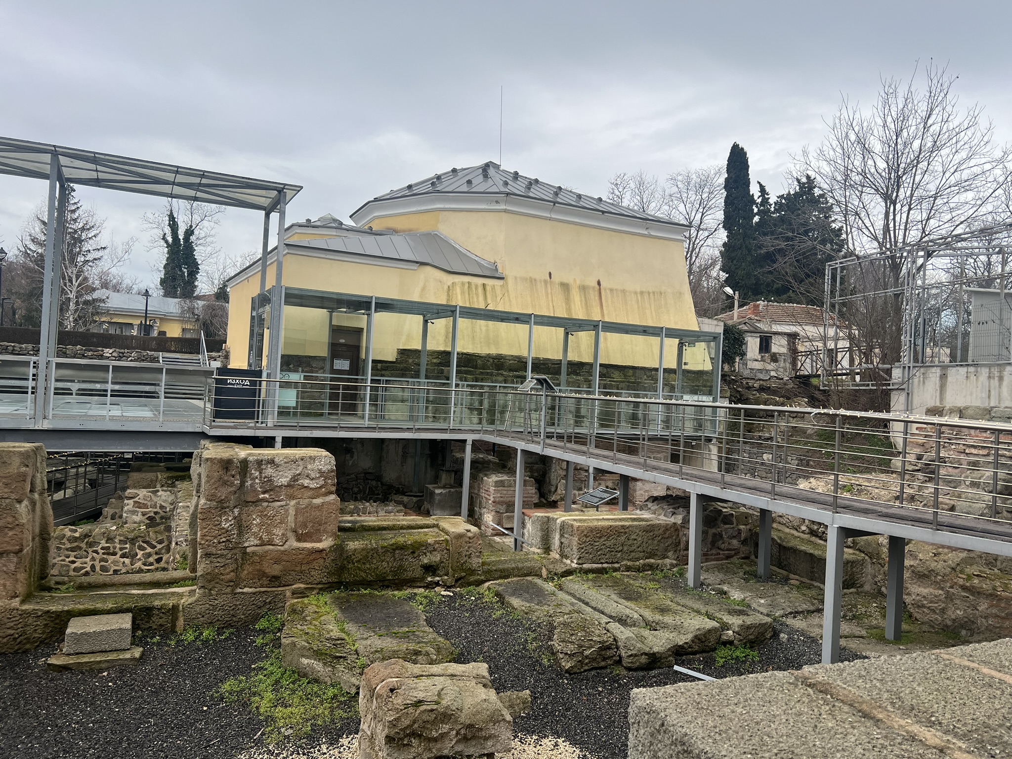 Его построили в 2022 году. Развалины римских бань накрыли, частично восстановили. Провели археологические раскопки. Золотые монеты и печати, найденные тут, выставлены в музее.